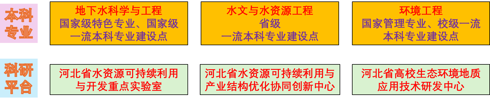 拥有地下水科学与工程(国家级特色专业、国家级一流本科专业建设点)、水文与水资源工程(省级一流本科专业)、环境工程(国家管理专业、省级一流本科专业建设点)三个本科专业,专业入选“双万计划”达到100%,3门课程入选国家级一流本科课程。拥有河北省重点学科“水文学及水资源”,河北省高等学校本科教育创新高地“水利水电教育创新高地”,河北省高等学校实验教学示范中心“水资源环境实验教学中心”,河北省高等学校品牌特色专业“地下水科学与工程专业”以及“水文与水资源工程专业”,河北省示范性专业学位研究生培养实践基地“地质工程专业领域”,河北省水资源可持续利用与开发重点实验室、河北省水资源可持续利用与产业结构优化协同创新中心、河北省高校生态环境地质应用技术研发中心、河北省地下水系统新污染物行为与效应重点实验室等教学及科研平台。