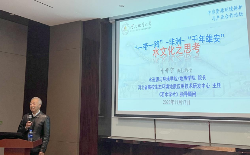 于开宁院长作了题为“一带一路”-非洲-“千年雄安”水文化之思考的主题报告。报告通过“一带一路”与非洲、雄安新区关系及其共同面临的水资源环境问题的梳理分析,结合悟水历程、雄安新区规划建设的思考、习近平的水文化情怀等研究,探讨了雄安新区及海河流域丰富多样的地质文化资源,提出了“千年雄安”水文化研究与建设的思考。认为,京津冀协同发展以及雄安新区建设有着明显水文化机制,生态水文化将成为21世纪人类新主旋律文化;感悟水文化,启迪“未来之城”“中非命运共同体”“一带一路”。