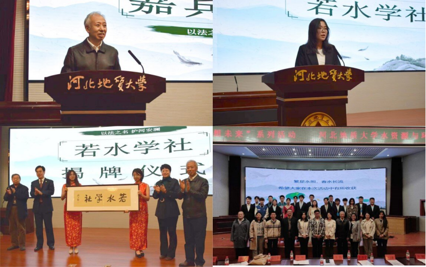 (左上院长于开宁致辞;右上社长梁嘉琦致辞;左下嘉宾揭牌授牌;右下若水学社师生合影)