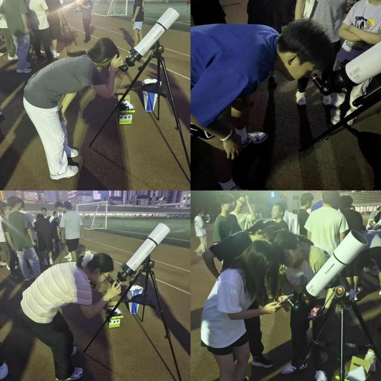 24级学子以班级为单位有序列队。来自石家庄天文爱好者协会的两位科技辅导员化身“星际领航员”,为同学们带来了一场精彩的天文知识讲解。他们从月亮的环形山讲到月海,从月亮的阴晴圆缺讲到地球潮汐活动,再到中国历法;让学生亲身体验使用望远镜观测月球的乐趣,还学习如何利用望远镜和自己的手机拍摄月球照片。让学生亲眼目睹宇宙的神奇。