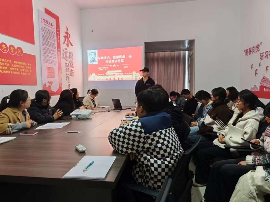 2024级学生曲宝申分享民族英雄杨靖宇将军的事迹,吸引社区内数名师生参与,现场氛围庄重肃穆,红色精神感染力十足。