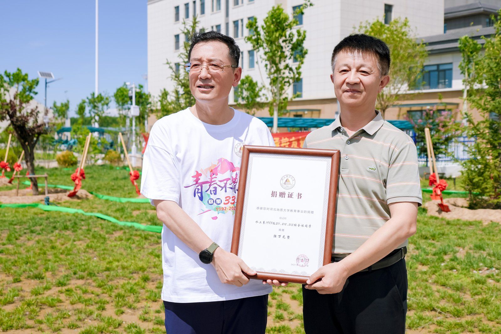 在新校区,校友们隆重举行“水工园”校友林的捐赠仪式。档案馆馆长、教育发展基金会副理事长郭震致辞,并向校友代表仲建军颁发捐赠证书。仪式由校友办主任、教育发展基金会秘书长王东东主持。